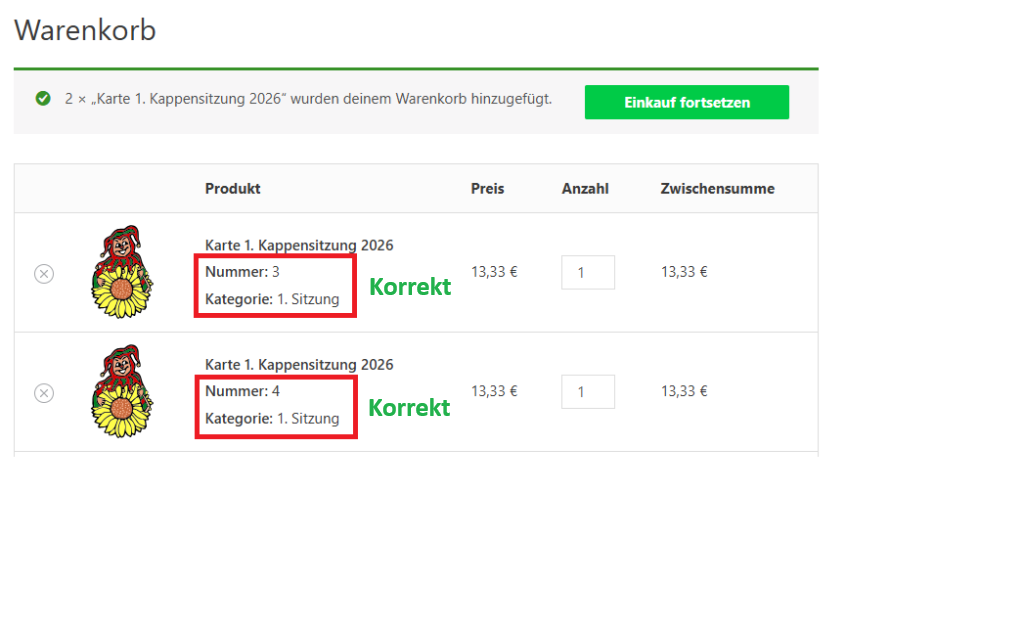 Achtet Bitte im Warenkorb bei Sitzplatzkarten auf die Sitzplatznummer der jeweiligen Karten. Sollte hier keine Sitzplatznummer, wie im Beispielbild, zu sehen sein, setzt den Einkauf nicht fort! Entfernt die Karten aus dem Warenkorb und wählt diese nochmals neu aus. Es ist unbedingt nötig, dass die Sitzplatznummer mit den Karten verknüpft ist. Ansonsten können wir die Bestellung nicht annehmen und müssen diese stornieren.